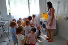 Дальше дети посетили в прачечную. Там они познакомились с работником по ремонту и стирке белья, которая рассказала о том, что она стирает и гладит бельё для всех детей детского сада.