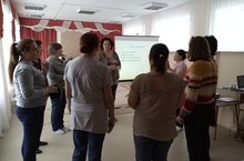 Сегодня воспитатели по обучению татарскому языку Шайдуллина Г.И., Исмагилова И.Ф. провели с педагогами тренинги по использованию УМК по обучению детей татарскому языку в образовательном процессе. Воспитатели разделились на возрастные группы, и каждая группа разрабатывала свою языковую среду в соответствии с возрастом.
