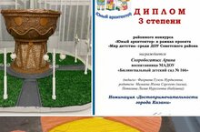 В районе прошел конкурс " Юный архитектор" в рамках проекта " Мир детства" среди ДОУ Советского района. Из нашего детского сада в конкурсе приняла участие воспитанница подготовительной группы Скоробогатых Арина и ее мама с бабушкой в номинации " Достопримечательности города Казани".Они достойно представили свою работу и стали призерами конкурса. Заслуженое III место. Поздравляем! Огромные молодцы!!!