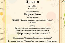 Воспитанник подготовительной группы Данил Ч.принял участие во Всероссийском конкурсе, посвященного Международному дню детской книги " Добрый мир любимых книг!" в номинации " Театр любимого произведения" с произведением Алан Мили " Винни - Пух и все - все- все". Данил стал дипломантом II степени. Поздравляем!!!