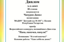 Воспитанник подготовительной группы № 1 ДАНИЛ Ч. ( воспитатель: Фахриева Гузель Нурдиловна), стал призером Всероссийского конкурса, посвященного Дню отца " Папа, папочка, папуля!" в номинации " Я и мой папочка!"