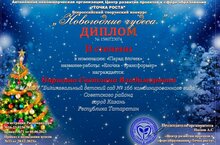 Воспитатель нашего детского сада Паршина Светлана Владимировна приняла участие во Всероссийском творческом конкурсе " Новогодние чудеса" . Поздравляем Светлану Владимировну с ДИПЛОМОМ II степени. Желаем творческих успехов.