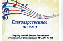 Музыкальный руководитель, Каримуллина Венера Равкатовна, награждена Благодарственным письмом за организацию и проведение районного конкурса вокальных дуэтов ОУ г.Казани "Две звезды - 2017" в номинации: ДОУ