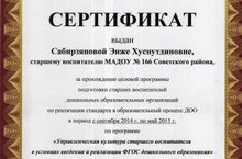 Старший воспитатель Сабирзянова Э.Х. прошла целевую программу старших воспитателей ДОО по реализации стандарта в образовательный процесс ДОО по программе "Управленческая культура старшего воспитателя в условиях введения и реализации ФГОС ДО"