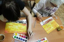 Мастер класс "Закат" для детей с ОВЗ школы интерната #4. Рисовали акварельными красками. Сам рисунок не сложный: нарисовали солнце, горизонт и дерево. Из цветовой палитры взяли три цвета: жёлтый, оранжевый и коричневый (чёрный). И добавили птичек для красоты.