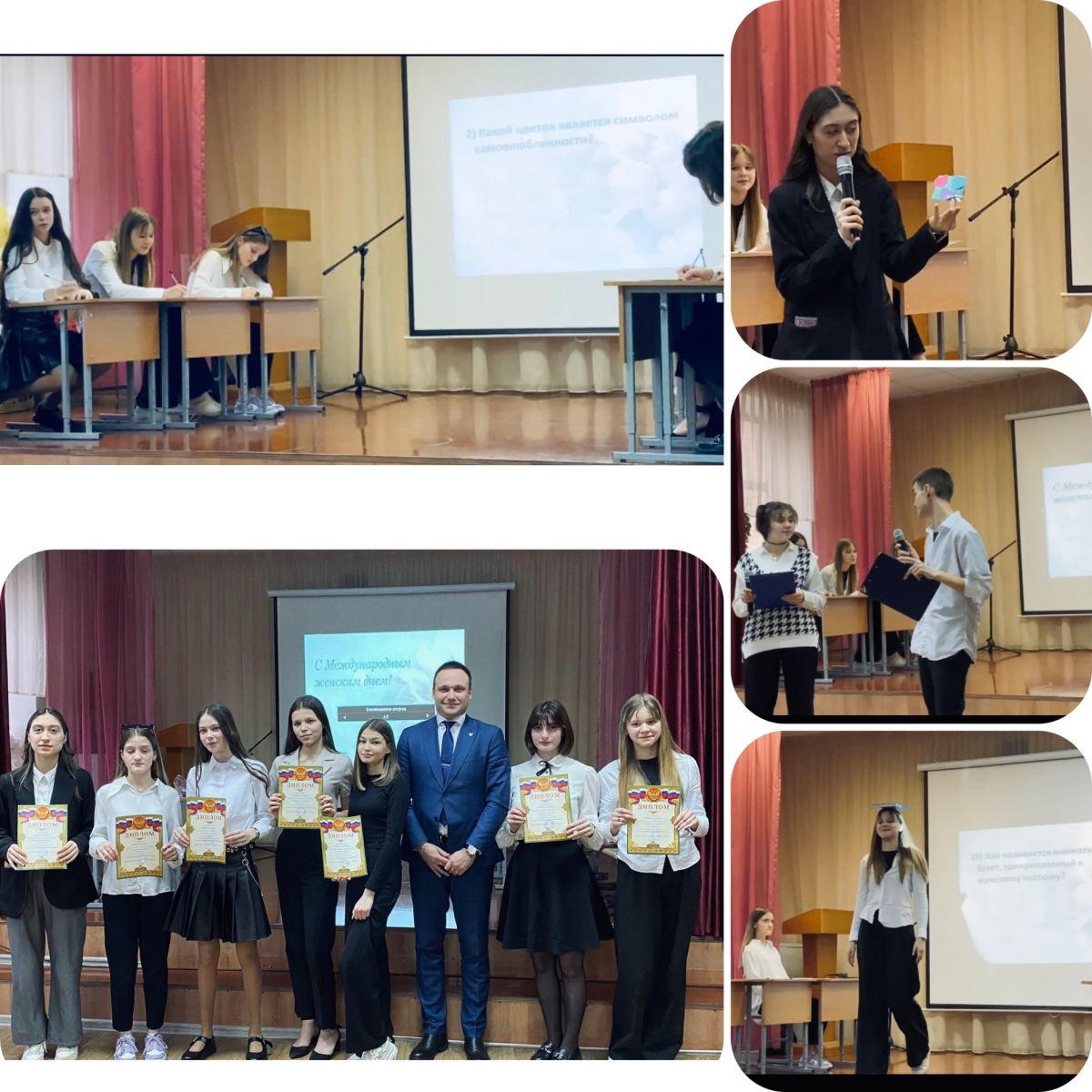 Сегодня девочки 8-11 класса принимали участие в школьном турнире , посвященном Международному женскому дню! Участницы соревновались в начитанности, красноречии, а также создавали красивые украшения своими руками.Каждая достойно выступила в конкурсе, а болельщики дружно поддерживали своих одноклассниц.