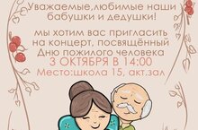 Дорогие наши бабушки и дедушки, в понедельник 3 октября в 14.00 в актовом заде школы состоится концерт, посвященный Дню пожилого человека. Приглашаем всех желающих на наше мероприятие!