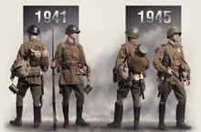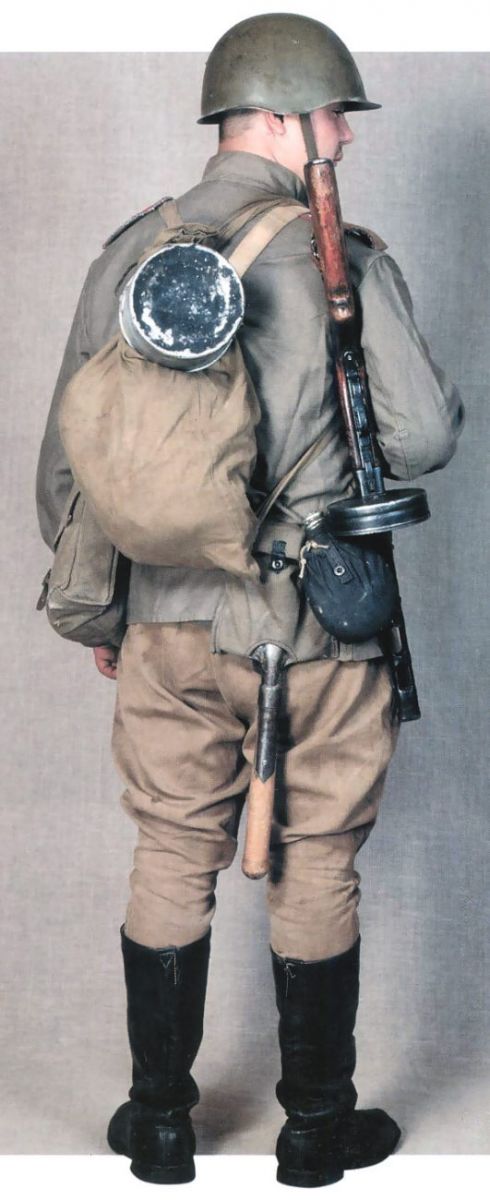 Немного из истории военной формы. С началом Великой Отечественной войны поменялось только что введённое пехотное снаряжение для бойцов, оказавшееся неудобным. Сухарный мешок и ранец были заменены вещевым мешком из водоупорной ткани. Шинельную скатку стали носить через левое плечо, а плащ-палатку, уложенную в чехол - через правое плечо. Летняя форма была обычной и облегчённой (без шинельной скатки и вещмешка). С целью унификации зимней и демисезонной полевой одежды для фронта Приказом НКО СССР №283 от 25 августа 1941 г. в качестве форменного предмета одежды была введена ватная телогрейка (куртка ватная стёганая с отложным воротником и петличными знаками различия), которую носили как под шинелью, так и без шинели с ватными шароварами (в отличие от телогрейки старого образца без воротника и знаков различия, предназначенной к ношению только под шинелью либо только в качестве рабочей формы одежды).
