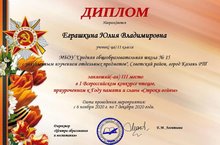 Ученица 11А класса Еграшкина Юлия приняла участие в I Всероссийском конкурсе чтецов, приуроченном к Году памяти и славы "Строки войны" со стихотворением Б. Окуджавы «До свидания, мальчики».