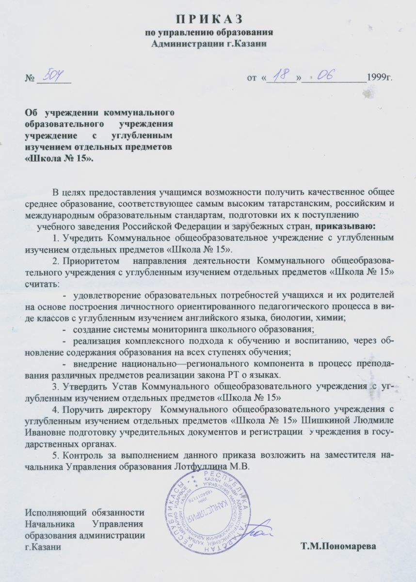 Решение Учредителя о создании муниципального учреждения МБОУ СОШ №15