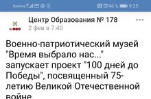 1 февраля 2020 Военно-патриотический музей "Время выбрало нас..." и учащиеся 10А класса запустили проект "100 дней до Победы", посвященный 75-летию Великой Отечественной войне.