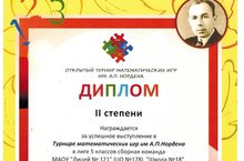 С 25 по 27 октября 2019 года проходил открытый турнир математических игр имени А.П.Нордена. Виват Никита, ученик 5В класса, в составе сборной команды в лиге 5 классов получил Диплом 2 степени.