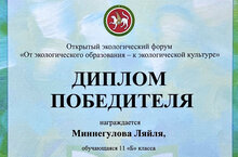 Поздравляем Миннегулову Ляйлю, ученицу 11Б класса, ставшую победителем открытого экологического форума «От экологического образования – к экологической культуре»