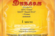 1. Диплом награждается ШУС “Сенат” МАОУ “Лицей №121” г.Казани занявший I место в Международном творческом конкурсе “Конкурсовик” в номинации: Сценарий школьного мероприятия. Работа: Сказка “Новогодние приключения”. Руководитель: Исламова Алсу Алгафовна.