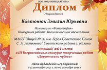 Ученица 6Д класса Ковтонюк Эмилия приняла участие в III Всероссийском конкурсе творческих работ «Дарит осень чудеса» и заняла в номинациях: