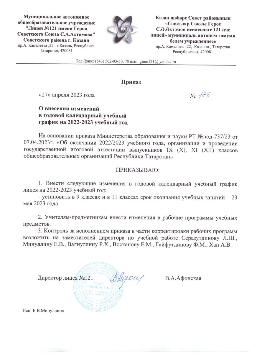 Приказ о внесении изменнений в годовой календарный учебный график на 2022-2023 уч.год