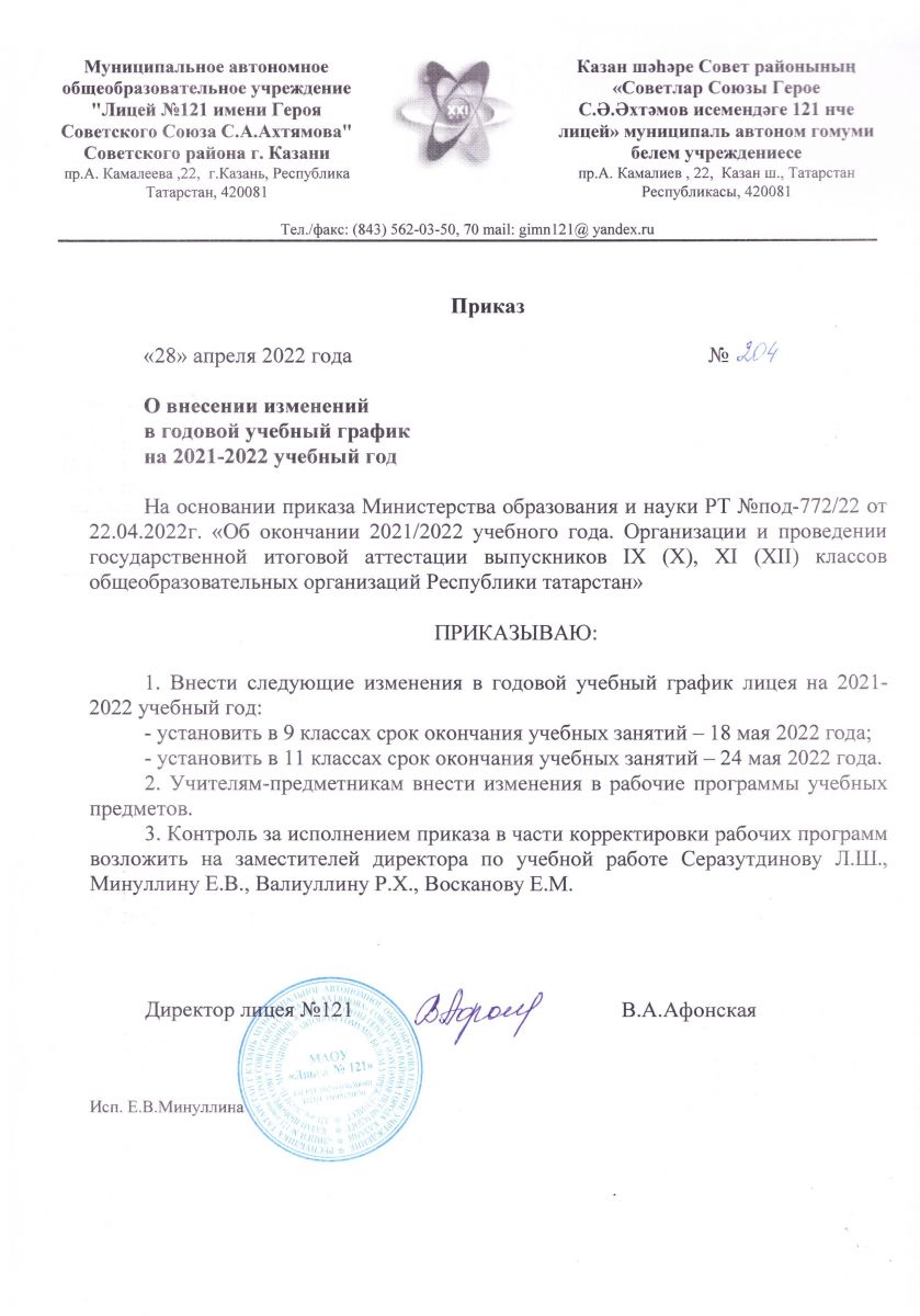Приказ о внесении изменнений в годовой календарный учебный график на 2021-2022 год