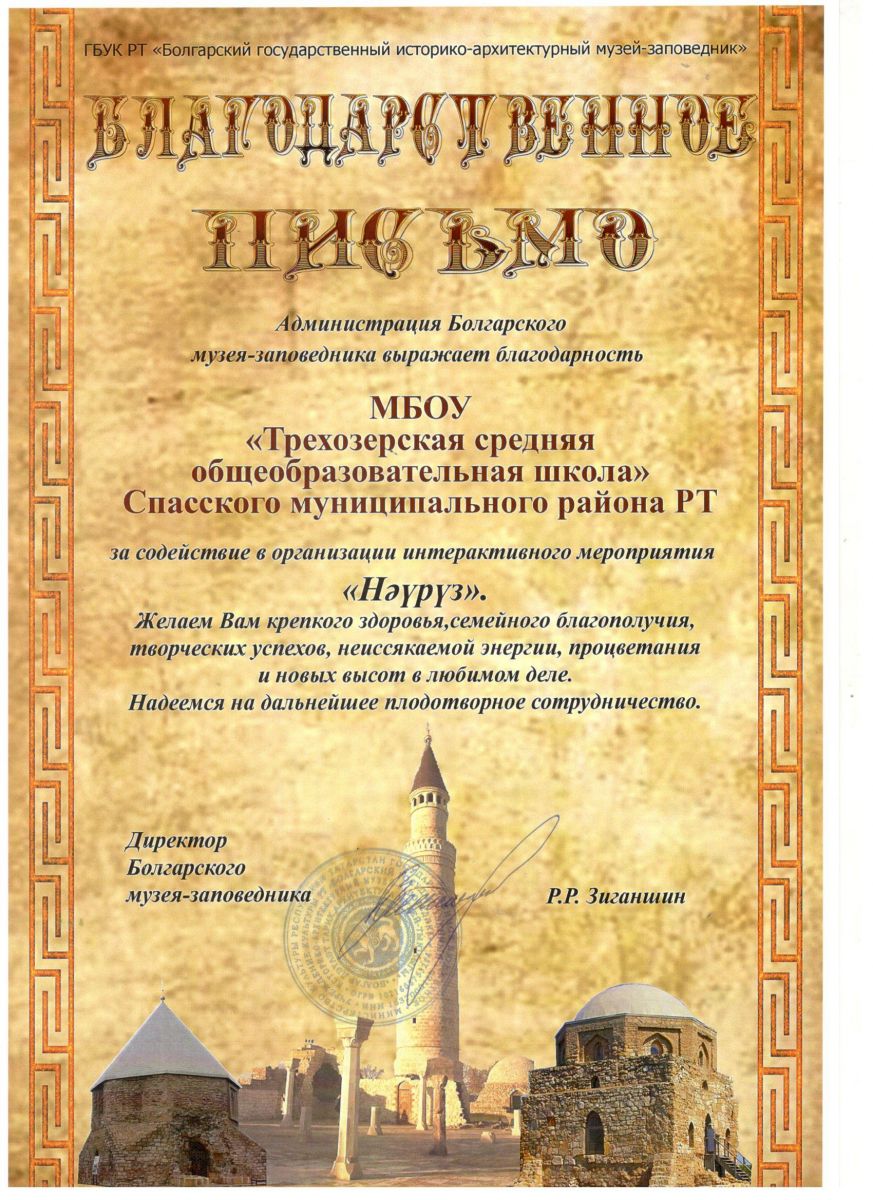 Благодарственное письмо из музея-заповедника
