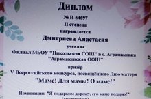 Дмитриева Анастасия, ученица 3 класса, приняла участие во Всероссийском конкурсе "Маме! Для мамы! О маме!" в номинации "Я подарком дорожу, его маме подарю!" (руководитель Филиппова Е.А.) и получила диплом II степени