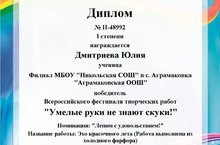 Дмитриева Юлия, ученица 9 класса, приняла участие во Всероссийском фестивале творчества "Умелые руки не знают скуки!" с работой из холодного фарфора "Эхо красочного лета" и получила диплом I степени, став победителем в номинации "Лепим с удовольствием!" (руководитель Солёнова Т.П.