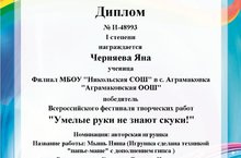 Черняева Яна, ученица 7 класса, приняла участие во Всероссийском фестивале творчества "Умелые руки не знают скуки!" с игрушкой, выполненной в технике "папье-маше" с дополнением гипса "Мышь Няша" и получила диплом I степени, став победителем в номинации "Авторская игрушка" (руководитель Солёнова Т.П.)