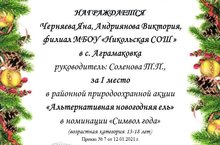 Андриянова Виктория (8 класс), Черняева Яна (7 класс) под руководством учителя технологии Солёновой Т.П. приняли участие в районной природоохранной акции "Альтернативная новогодняя ель" в номинации "Символ года" и стали победителями в своей возрастной группе. Поздравляем девочек и учителя с победой!