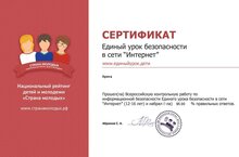 Наши учащиеся приняли активное участие в данной контрольной работе. В конце теста обучающиеся получили сразу результаты своего тестирования, а также получили бесплатный электронный документ об успешном прохождении контрольной работы и об участии в Едином уроке безопасности в сети «Интернет» в 2022 году со своими результатами.