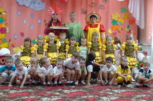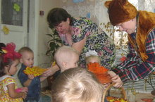 Заканчивается адаптационный период в первых младших группах детского сада «Колосок». По словам воспитателей, ребята уже многому научились и многое умеют. Самое важное: малыши начинают слышать и воспринимать слова воспитателя. Значительно пополнился словарный запас детей, они выучили много потешек, стихов, песен. Целый месяц они готовились к празднику Осени. И вот, наконец, этот долгожданный день настал. У детей это первый утренник в садике. Чтобы дети не отвлекались - родителей на него не пригласили.