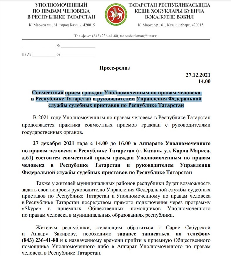 Совместный прием граждан Уполномоченным по правам человека в Республике Татарстан и руководителем Управления Федеральной службы судебных приставов по Республике Татарстан