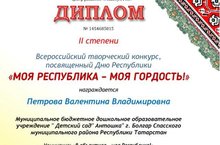 Наш педагог Петрова Валентина Владимировна приняла участие во всероссийском творческом конкурсе ко Дню Республики " Моя Республика- моя гордость!" и заняла почётное второе место диплом второй степени !!! Поздравляем!!! Молодец!!!