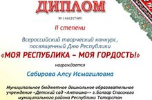Наш педагог Сабирова Алсу Исмагилловна также приняла участие во Всероссийском творческом конкурсе ко Дню Республики " Моя Республика-моя гордость!" заняла второе почётное место .Диплом второй степени. Поздравляем!!! Молодец!!!