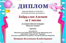 Воспитанник Хайруллин Азамат получил диплом 1 место во всероссийском конкурсе «Хочу все знать!»