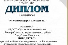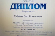 Наш педагог Сабирова Алсу Исмагилловна приняла участие во Всероссийской олимпиаде среди педагогов дошкольных образовательных учреждений и также получила диплом победителя! Поздравляем!!!
