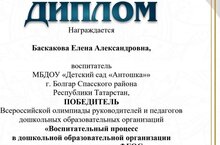 Наш педагог Баскакова Елена Александровна приняла участие во Всероссийской олимпиаде среди педагогов дошкольных образовательных организаций и получила диплом победителя!!!! Поздравляем!!! Так держать!!!!