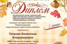 Наш педагог Петрова Валентина Владимировна получила диплом за 1 место в Республиканском конкурсе творческих работ " Красавица осень".
