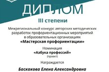 Наш педагог Баскакова Елена Александровна также получила диплом III степени в Межрегиональном конкурсе авторских методических разработок профориентационных мероприятий в образовательных организациях "Мастерская профориентации".Номинация "Азбука Профессий". Поздравляем!!!!