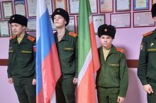 Сегодня на Торжественной линейке Государственные гимны под государственными флагами РФ и РТ пели кадеты 7 класса Лисов С. и Мартынов М.