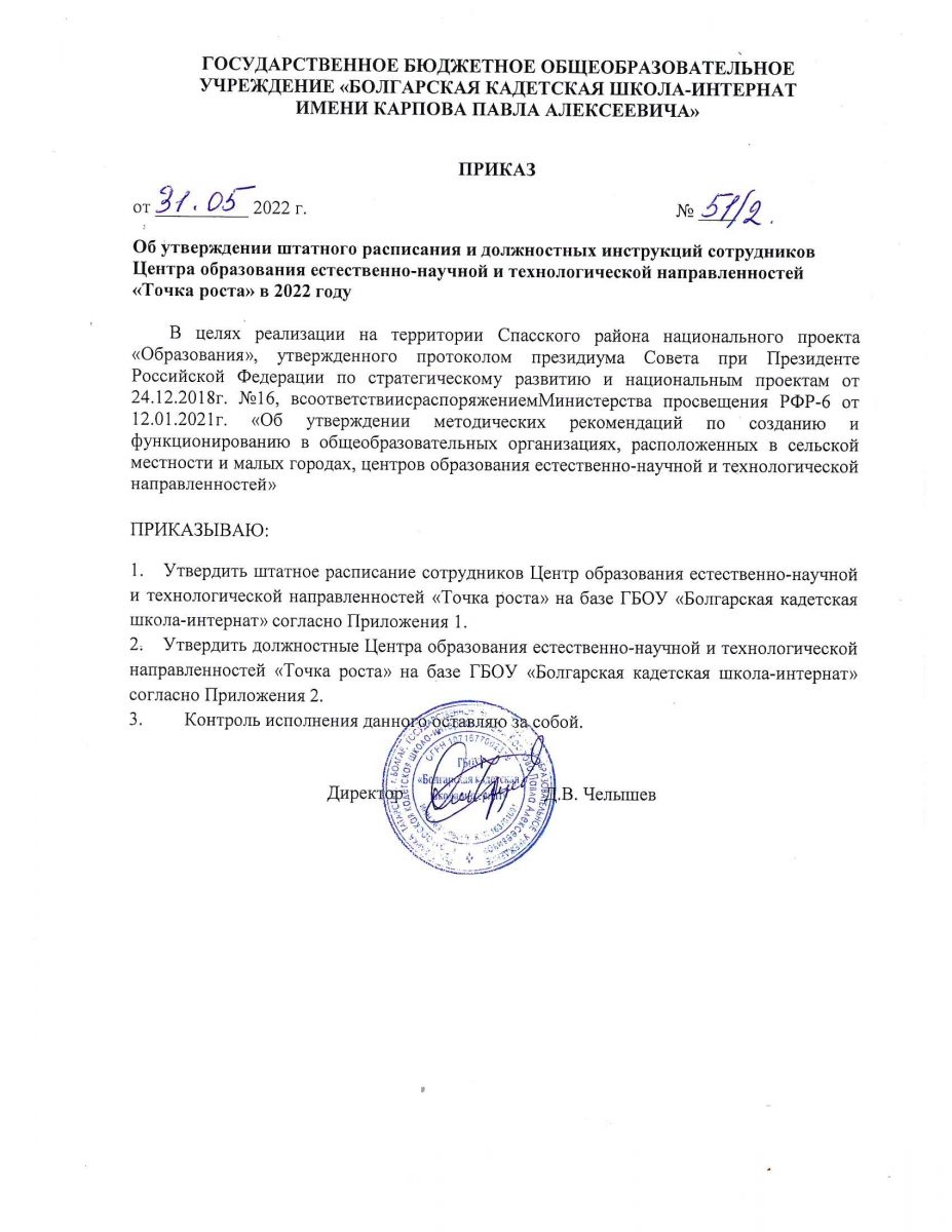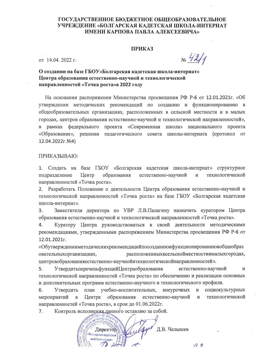 Приказ о создании Центра образования "Точка роста"