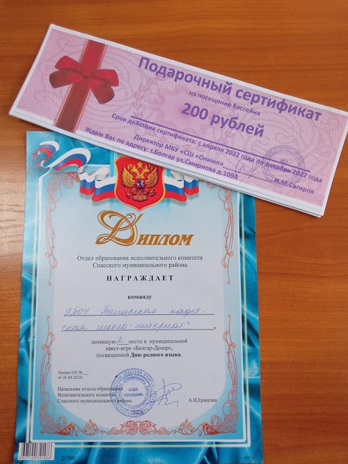 Опубликовано: 28.04.2022Наша команда «Кадеты» приняла участие в районной квест-игре «Болгар-Дозор», которая проходила на территории БГИАМЗ. В ходе игры ребята выполняли различные задания и по истории края, и по творчеству Г.Тукая. По итогам игры наша команда заняла второе место из 12 команд!