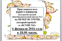 Быстро минули школьные года, зато остались дорогие сердцу люди, с которыми приятно встретиться и вспомнить былые времена в уютном кругу выпускников. Приглашаем всех ВЫПУСКНИКОВ Болгарской средней общеобразовательной школы № 2 на ВЕЧЕР ВСТРЕЧИ, который пройдёт в нашей школе 6 февраля 2016 года в 18.00 часов.