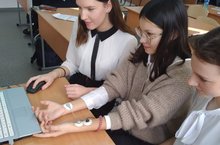 Ученики 10 класса за выполнением лабораторной работы "Влияние дыхания на нерегулярность сердечного ритма" -