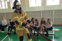 После получения теоретических сведений, девушки попробовали привести огнетушитель в боевое состояние и потушить очаг возгорания. А юноши участвовали в одевании боевки, разворачивании пожарного рукава, подсоединению его к распределителю, и тушению очага возгорания.