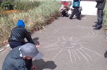 Юные творцы превратили серую асфальтную площадку в летнюю яркую полянку.