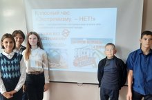 В 8 классе был проведён классный час "Экстремизму - нет", на котором ребята узнали о природе этого явления, о борьбе с террористами, о распространении влияния террористических организаций на территории страны и в мире. Много внимания было уделено тем моментам в жизни, когда угроза становится реальной, и правилам поведения в этой ситуации.