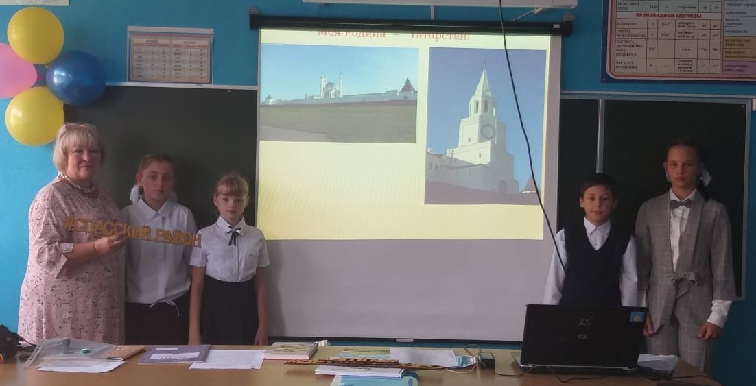 «Моя Родина – Татарстан» так назывался классный час, посвященный 100-летию ТАССР, который прошел в 5 классе. На уроке ребята закрепили свои знания о государственной символике Татарстана. Читали стихотворение «Что мы Родиной зовем?» на русском и татарском языках. С ребятами поговорили о том, что Татарстан в настоящее время является развитым промышленным и культурным центром. Вспомнили государственные и религиозные праздники. В конце классного часа ребята собирали пословицы о Родине и сделали вывод, что Татарстан является республикой мира, согласия, дружбы и взаимопонимания. 100 Татарстана.jpg 5 класс 100 татарстана.jpg