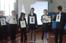 Сегодня в школе прошел КВН по русскому языку. Здесь приняли участие учащиеся 7-9 классов. Учащиеся показывали свои знания в области русского языка и литературы. Когда команды отвечали на вопросы, учащиеся начальных классов поставили сценку про знаки припенания.