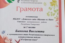 Наша воспитанница Бынкова Виолетта приняла участие в муниципальном этапе Республиканского творческого конкурса детских поделок "Я и Красная книга" и заняла I место. Педагог Бухлаева Надежда Юрьевна.