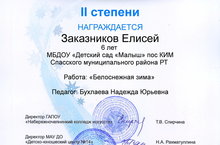 Сегодня мы поздравляем нашего воспитанника подготовительной к школе подгруппы Заказникова Елисея. награжденного Дипломом 2 степени, за работу в региональном конкурсе рисунков "Зимы волшебные узоры". Так держать!