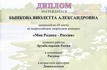 Наши воспитанница, Бынкова Виолетта, приняла участие во всероссийском творческом конкурсе "Моя Родина - Россия" и заняла 3 место. Поздравляем с Победой!!!