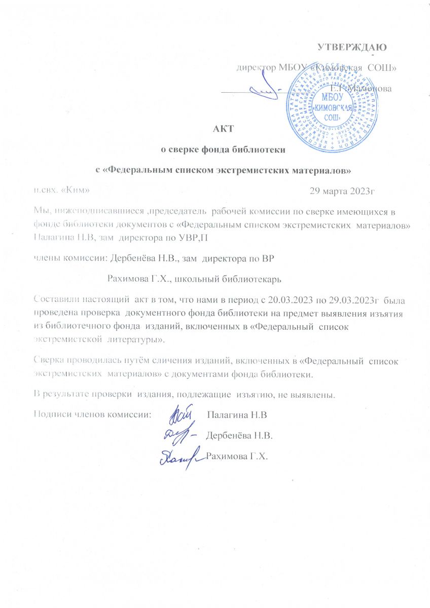 Акт о сверке фонда библиотеки с "Федеральным списком экстремистских материалов"
